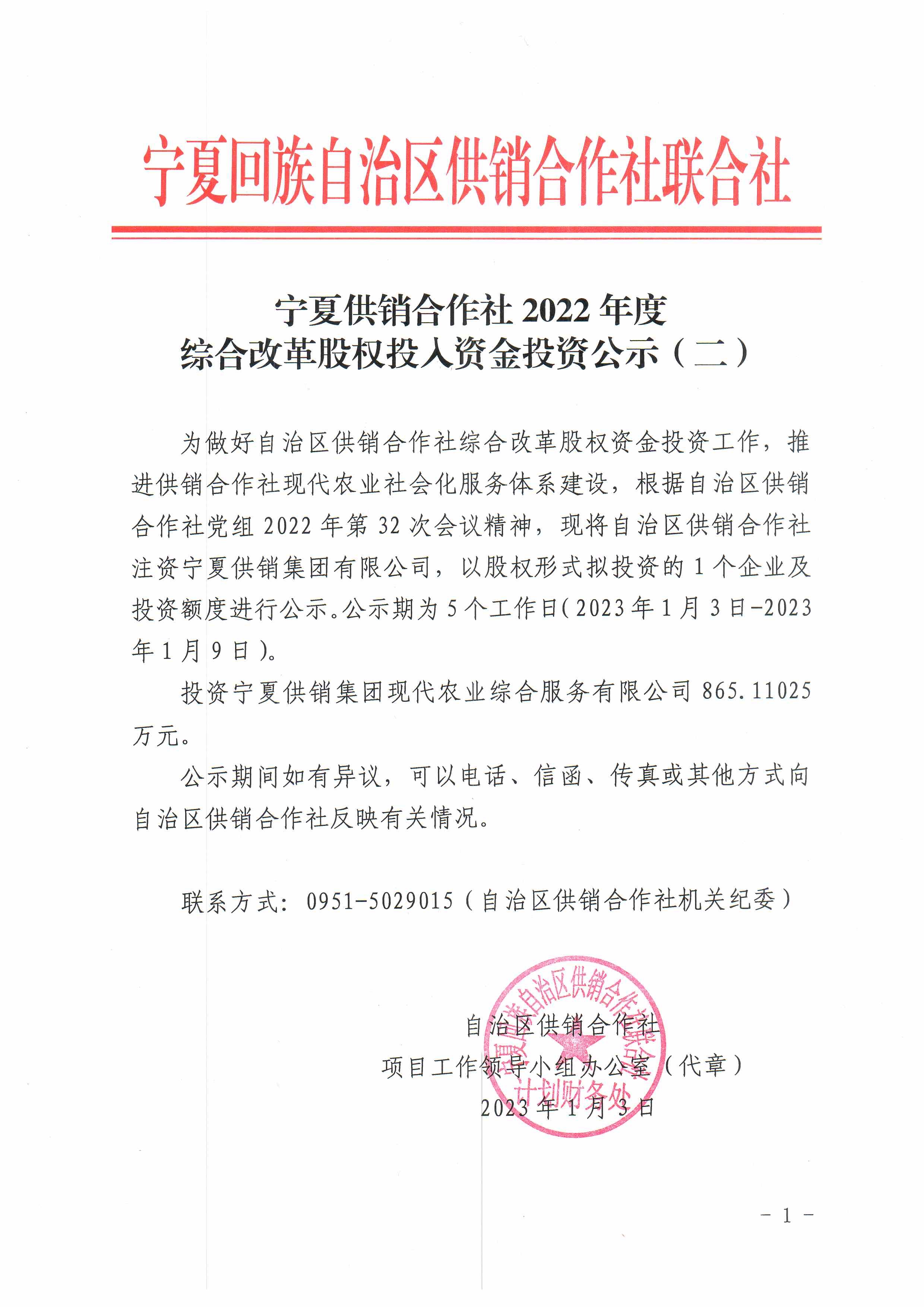 宁夏供销合作社2022年度综合改革股权投入资金投资公示(二)