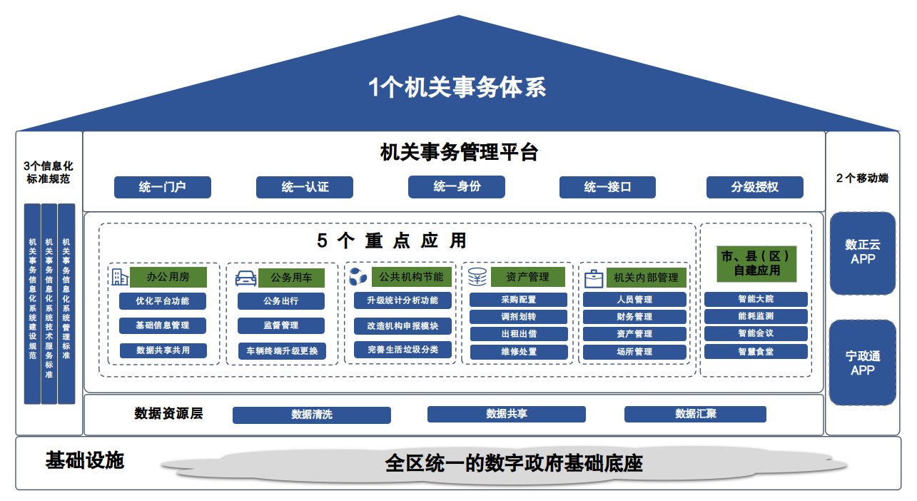 基于“大平台、广应用、微服务”理念,依托全区统一的电子政务云、电子政务外网等基础设施底座,重点推进机关事务各业务系统标准化、规范化建设,根据不同使用对象,分级别、分岗位提供个性化功能,办公用房、公务用车、节能管理、资产管理平台实现线上申请、部门审核、领导审批等,实现物业服务、会务服务等一网通办、一网通管、一体协同。依托宁政通APP移动入口,推动机关事务服务事项办理渠道向移动端拓展,强化“移动办事”能力,打造“指尖服务中心”,汇聚、整合机关事务各业务服务。基于宁政通APP的消息功能,建立全区机关事务部门及相关单位联系机制,实现机关事务工作信息等及时发布。